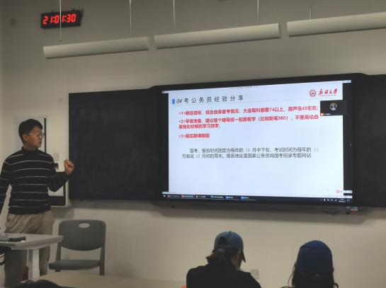 交流会上,研三吴腾辉、李鹏胜同学,大四庹浩博同学,结合个人、社会、国家三角度,从选报公务员初衷、提高公文写作能力、如何学会说“官话”;行测刷题上分速度、准确性和难点攻坚;从多看官方政策性新闻、评论员文章和进行大量写作、练字等多个方面为有考公意向的同学提出了良好建议。李鹏胜同学以自己为例,围绕规避报录比过高岗位、多关注硬性备注、自身学习习惯、家庭状况以及个人备考进度,在选岗问题上“现身说法”,提醒学弟学妹们合理选择报考岗位,切忌盲目跟风;庹博浩同学结合前两位同学的发言,系统详细地分析了当下省考题的各模块,给出了自己对这些模块的独到见解。